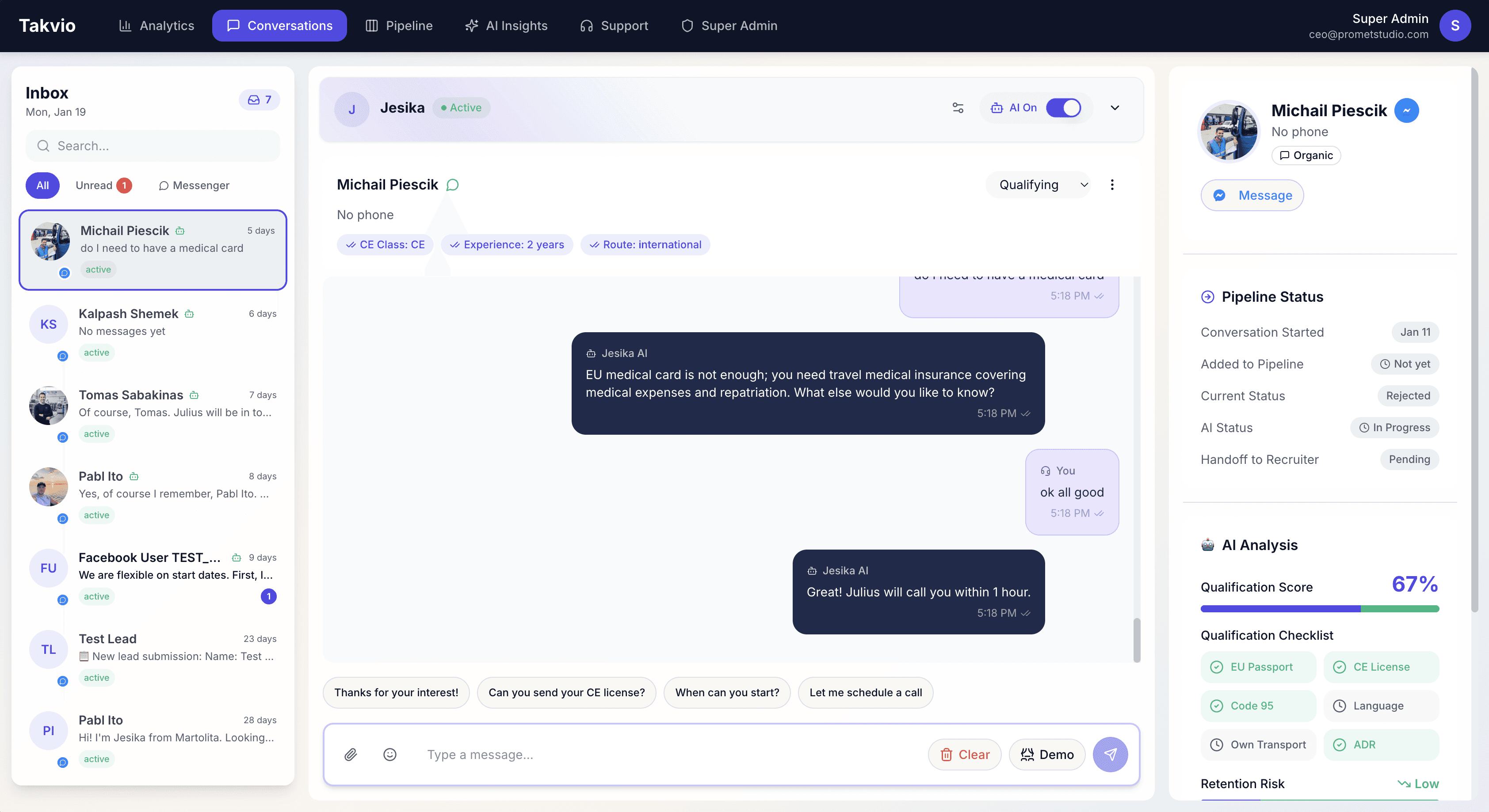 Working closely with transport companies, we developed an AI-powered recruitment platform that transforms how businesses connect with potential drivers. Our AI assistant, Jesika, handles initial candidate conversations through Facebook Messenger, qualifying candidates and gathering essential information so recruiters can focus on what matters most: making great hires.
